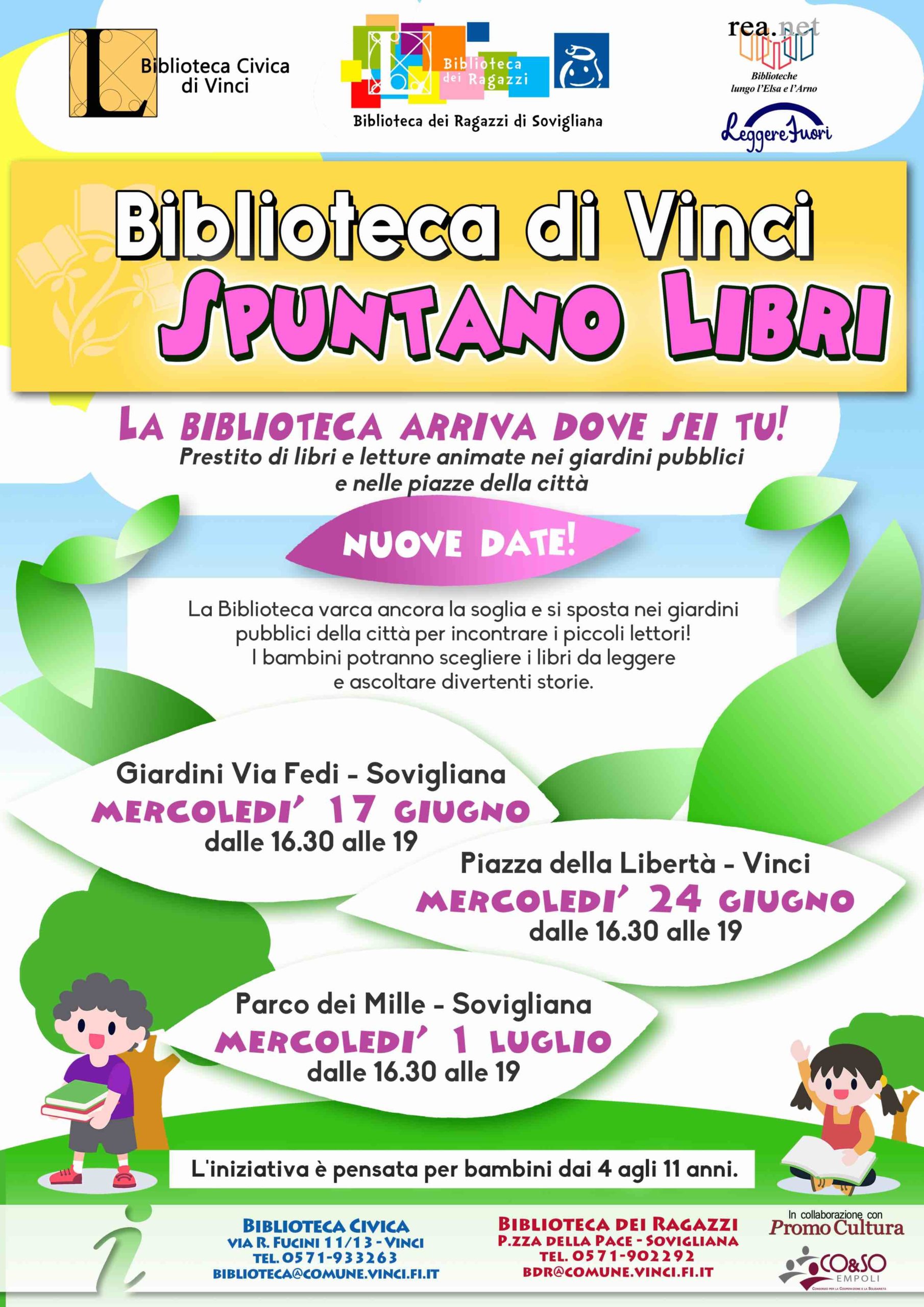 La biblioteca comunale di Vinci varca la soglia e chiama a raccolta bambini e famiglie nei parchi verdi della città. Mercoledì 17 giugno, infatti, parte l'iniziativa “Spuntano libri. La biblioteca arriva dove sei tu!”, prestito di libri e letture animate all'aperto.