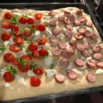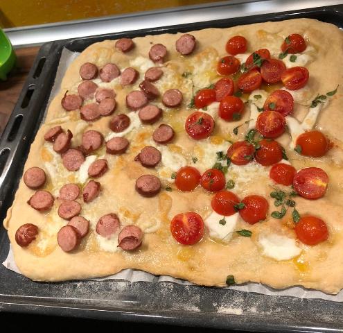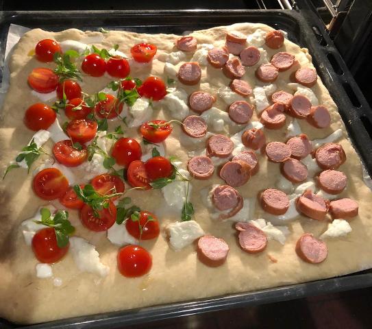 Versate la farina, l’acqua, l’olio, il lievito e sale in una ciotola e mescolare fino ad ottenere un impasto abbastanza omogeneo. Lasciare riposare per 24 ore l’impasto coperto da un canovaccio e preferibilmente in un luogo chiuso. Stendete la pasta grossolanamente in una teglia con carta da forno. Cuocere in forno preriscaldato a 180 gradi (molte ricevette suggeriscono temperature più alte ma noi l’abbiamo cotta lentamente) per circa 10 minuti la base, dopodiché condire e lasciate cuocere per altri 10 minuti. Condire a piacere. Noi abbiamo messo la mozzarella di bufala sfilacciata (precedentemente asciugata se no è troppo acquosa), per metà pomodorini ciliegino conditi con olio e sale e tagliati a metà e foglioline di rucola fresca (coltivata in terrazza), e per metà würstel.