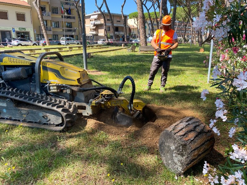 L’operazione di fresature dei ceppi rientra nel nuovo piano di manutenzione del patrimonio arboreo cittadino ed è propedeutica alla reimpianto di nuovi pini che avverrà nel prossimo autunno.