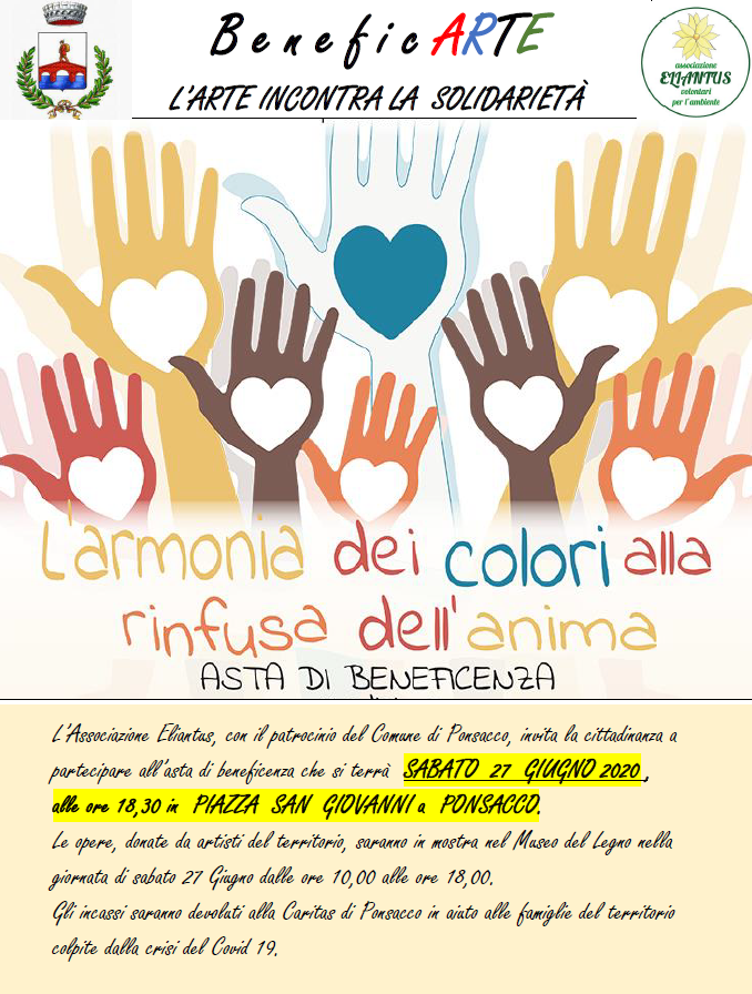 Sabato 27 Giugno Piazza San Giovanni a Ponsacco ospiterà una bellissima iniziativa di arte e solidarietà organizzata dall’Associazione Eliantus con il patrocinio del Comune di Ponsacco. L’emergenza sanitaria da Covid 19 ha provocato una crisi economica altrettanto difficile, facendo emergere nuove povertà e situazioni fragili. Nasce da qui l’idea dell’Associazione Eliantus, guidata dalla sua presidentessa Monica Mariani, di organizzare un’asta di beneficenza con opere d’arte donate da artisti del territorio. Il ricavato sarà interamente devoluto alla Caritas di Ponsacco per l’acquisto di generi alimentari in favore delle famiglie più disagiate.