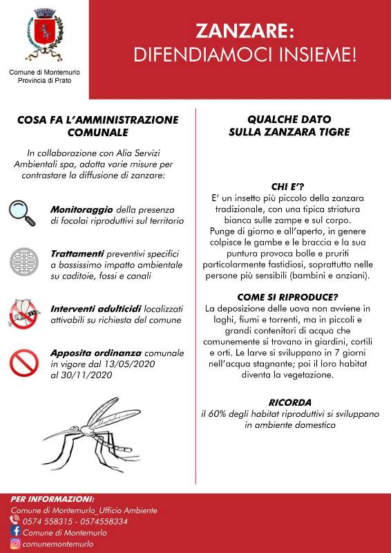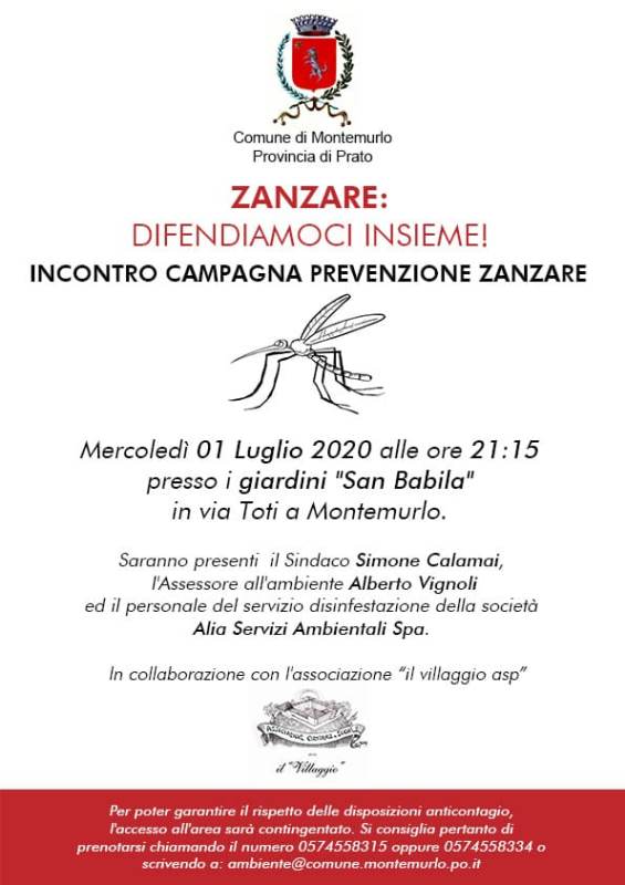 Per difendersi efficacemente dalla proliferazione delle zanzare è necessario l'impegno di tutti. Per questo motivo il Comune di Montemurlo, come annunciato nelle settimane scorse all'avvio della campagna di disinfestazione, ha organizzato un incontro aperto alla cittadinanza in programma per mercoledì 1 luglio ore 21 ai giardini di San Babila in via Toti a Oste. Interverranno il sindaco Simone Calamai, l'assessore all'ambiente, Alberto Vignoli e il personale del servizio disinfestazione di Alia Spa; l'iniziativa è realizzata in collaborazione con l'associazione “Il villaggio”.