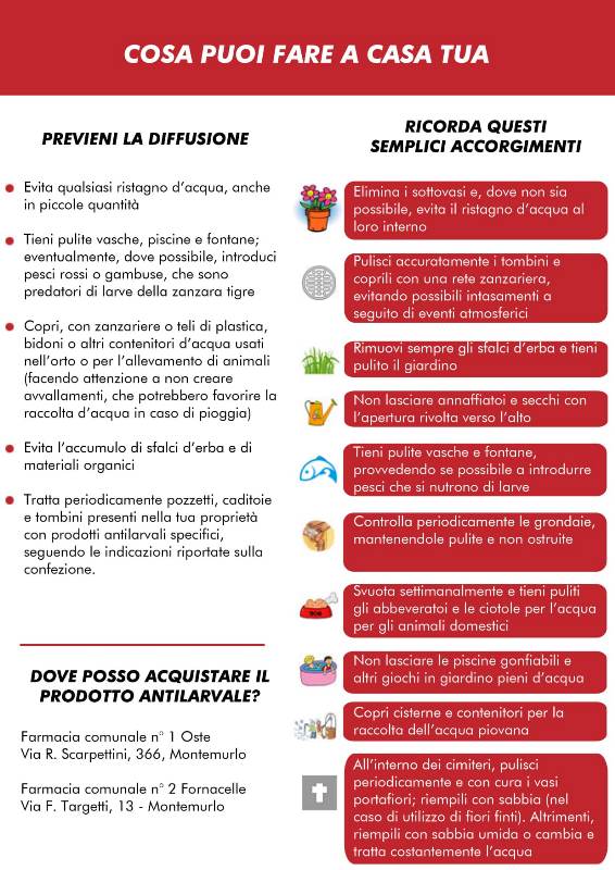 Da qualche giorno nelle farmacie comunali Farmacom di Oste e Fornacelle, inoltre, è in vendita il prodotto anti-larvale per impedire la riproduzione delle zanzare.Si tratta di pastiglie a base di silicone che, una volta a contatto con l'acqua, formano un film che impedisce la deposizione e proliferazione delle uova di zanzara. Inoltre il Comune di Montemurlo ha prodotto un volantino informativo, che sarà distribuito in città, dove si ricordano i semplici accorgimenti per prevenire la diffusione della zanzara.