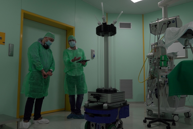 Il robot può essere tele-operato, ovvero mosso a distanza da un operatore ed è in grado di muoversi in sicurezza, evitando ostacoli e urti contro persone e oggetti. Il sistema robotico è dotato di una telecamera 3D che, con l’utilizzo di algoritmi intelligenti di visione, è in grado di riconoscere la presenza di persone e di caratterizzare gli ambienti di lavoro, garantendo l’incolumità delle persone e l’ottimizzazione della disinfezione. Il controllo e l’automatizzazione delle operazioni da parte degli operatori sarà reso più facile e intuitivo attraverso una opportuna app che si collega al robot.