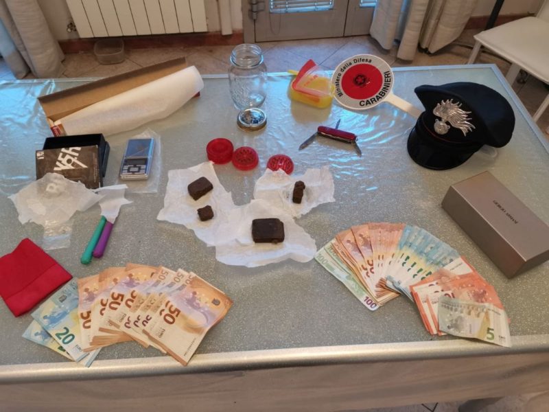 Nel corso della perquisizione effettuata presso la sua abitazione, i militari hanno trovato 110 grammi di hashish, materiale per il confezionamento e un bilancino di precisione, tutto utilizzato per il confezionamento dello stupefacente . Insieme alla droga i carabinieri hanno sequestrato anche la somma contante di 2.400 euro, suddivisa in banconote di vario taglio, ritenuta provento dell’attività di spaccio.