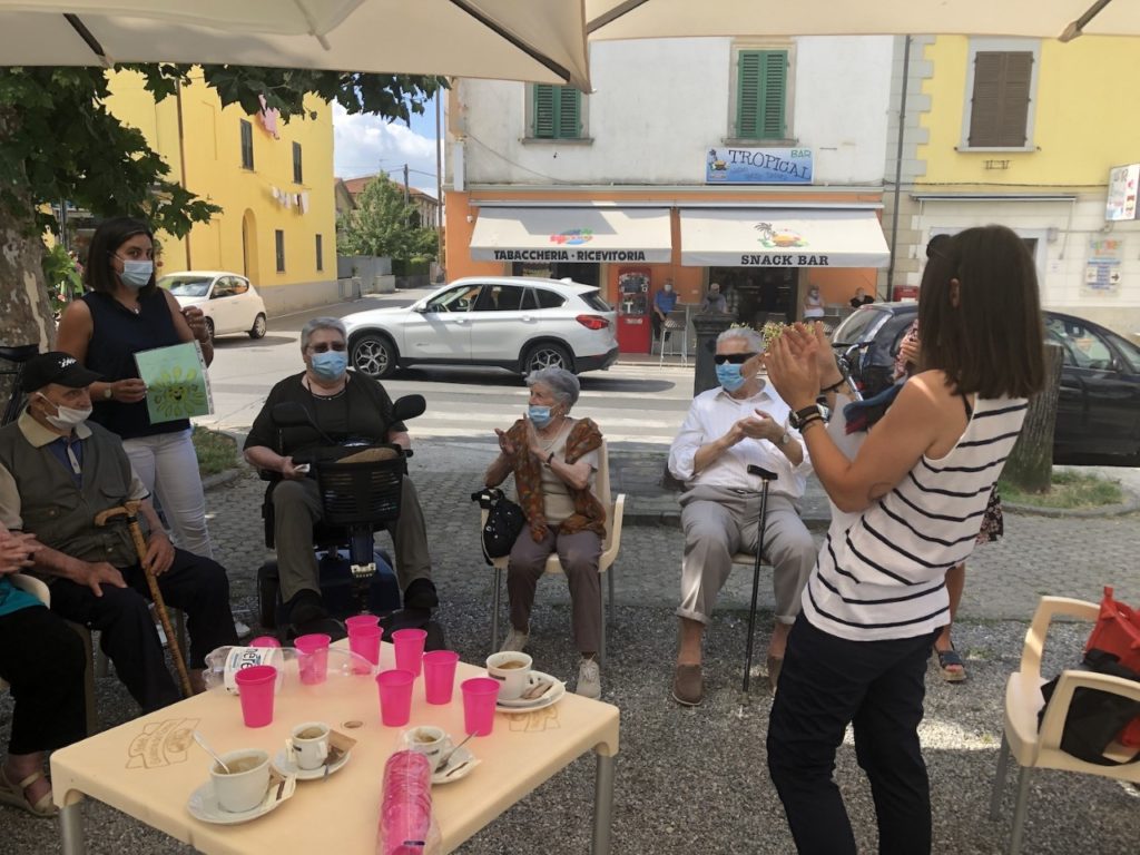 Una festa speciale per accogliere l’estate 2020: è quella che hanno organizzato il Centro diurno anziani L’Aquilone e l’amministrazione comunale per festeggiare l’arrivo dell’estate e salutare gli anziani della struttura, che dallo scorso marzo non sono più potuti andare nel centro di via Marconi, le cui attività sono sospese come previsto dai decreti del Presidente del Consiglio dei Ministri in materia di contenimento della diffusione del contagio da Covid-19. Così, dopo mesi di visite domiciliari garantite dagli operatori del Centro, e incontri a piccoli gruppi, stamani (martedì 30) è stato finalmente possibile rivedersi tutti insieme, all’aperto, nel rispetto delle distanze di sicurezza, in piazza a Spianate. Un incontro emozionante, che ha visto la presenza anche del sindaco, Sara D’Ambrosio e dell’assessore al sociale, Ilaria Sorini.