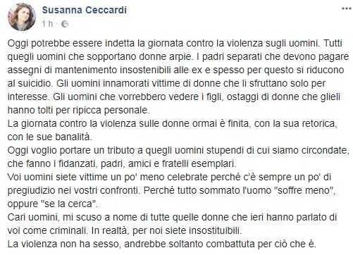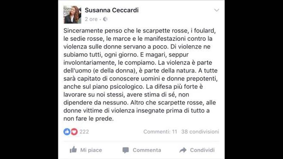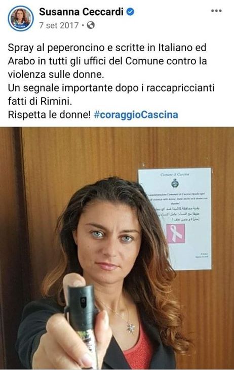 Per rincarare la dose contro l'ex sindaco di Cascina, Barnini pubblica tre post su Facebook dell'avversaria politica a suo modo controversi: "Detto ciò dubito fortemente purtroppo che la candidatura di Ceccardi per quanto donna possa essere in qualche modo di garanzia per i diritti delle donne e nella diffusione di un modello culturale e di società rispettoso del ruolo delle donne. Solo per avere tre esempi riporto qua sotto i suoi post del 2016 in cui invitava le donne a non farsi prede, dando quindi a loro la colpa delle violenze subite, del 2017 in cui celebrava il fatto che sono gli uomini ad essere vittime di violenza e del 2018 in cui regalava spray al peperoncino lasciando intendere che la violenza è quella che subiamo per strada e non quella tra le mura domestiche. Chiudiamo questa parentesi poco costruttiva di inizio campagna elettorale e parliamo di Toscana ai toscani come Eugenio Giani ha sempre fatto".