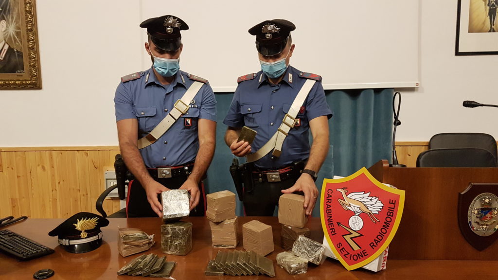 I militari del Radiomobile, intorno alle 2, hanno fermato un’autovettura per un controllo alla circolazione stradale e, insospettitisi, hanno deciso di effettuare un’accurata perquisizione dagli esiti alquanto inaspettati. Nel bagagliaio del veicolo, i carabinieri hanno rinvenuto quasi 10 kgdi hashish, suddivisa in undici “panetti” preconfezionati in cellophane.