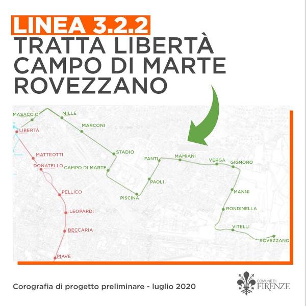 Il progetto preliminare prevede la prosecuzione della linea da viale Don Minzoni con il sottoattraversamento della linea ferroviaria all’altezza di piazza delle Cure da dove imboccherà viale dei Mille per arrivare allo stadio. La linea continua su viale Fanti, via Mamiani, viale Duse, via del Gignoro fino ad arrivare in via della Chimera e al capolinea Rovezzano. Qui verrà realizzato anche un nuovo parcheggio scambiatore. Tra le opere strutturali oltre al sottottraversamento del cavalcavia delle Cure anche il sovrappasso del Mensola all’altezza di via della Chimera. Importanti anche le stime sul futuro utilizzo della linea: 12 milioni passeggeri previsti all’anno per la sola tratta Libertà-Campo di Marte-Rovezzano che raddoppiano arrivando a 24 milioni se si considera l’intera linea Bagno a Ripoli-Rovezzano con 9.000 passeggeri nell’ora di punta (circa 4500 in più rispetto alla sola tratta Libertà-Bagno a Ripoli).