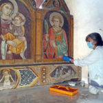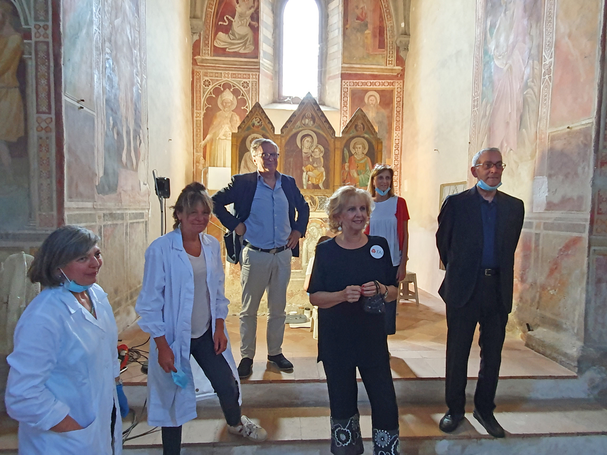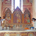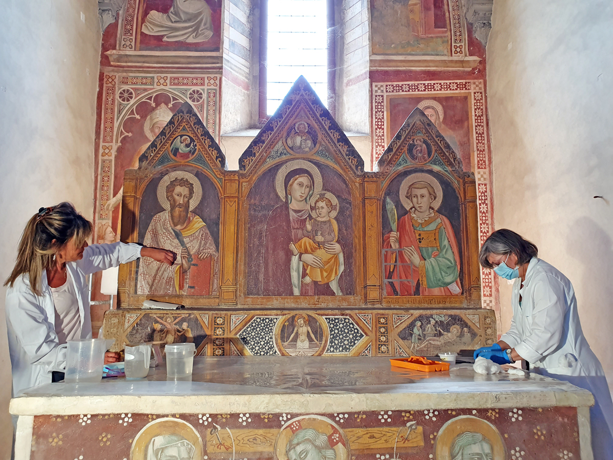 «La pittura murale della zona absidale e dell’altare risulta molto compromessa a causa di molteplici processi di degrado determinati da una serie di interazioni tra i materiali componenti la pittura e quelli provenienti dall’ambiente circostante – hanno sottolineato le due restauratrici Daniela Valentini e Grazia Ventura -. Il grosso problema degli affreschi è stata l’umidità di risalita che ha distrutto la parte inferiore e ha intaccato il bellissimo paliotto dipinto dell’altare. Molte sono anche le cadute di colore e degli intonaci nell’altare e nelle balze delle pareti. Altro problema riguarda la pulitura, alla fine degli anni ’70 i dipinti sono stati restaurati con tecniche molto probabilmente invasive e non sono stati rimossi bene i materiali apposti nei secoli precedenti e lo sporco che via via si è formato. L’urgenza del restauro è dunque fondamentale per evitare di perdere particolari unici. L’intervento è volto dunque ad arrestare il progredire del degrado stabilizzando le situazioni non recuperabili e determinando un miglioramento nella lettura degli affreschi. Dopo aver effettuato le analisi chimiche e fotografiche adesso ci stiamo adoperando per trovare la metodologia più corretta per eliminare le patine di fissativi alterati e riscoprire il colore originale. Dobbiamo quindi adesso rimuovere le sostanze utilizzate e poi inizieranno i veri e propri interventi di restauro».