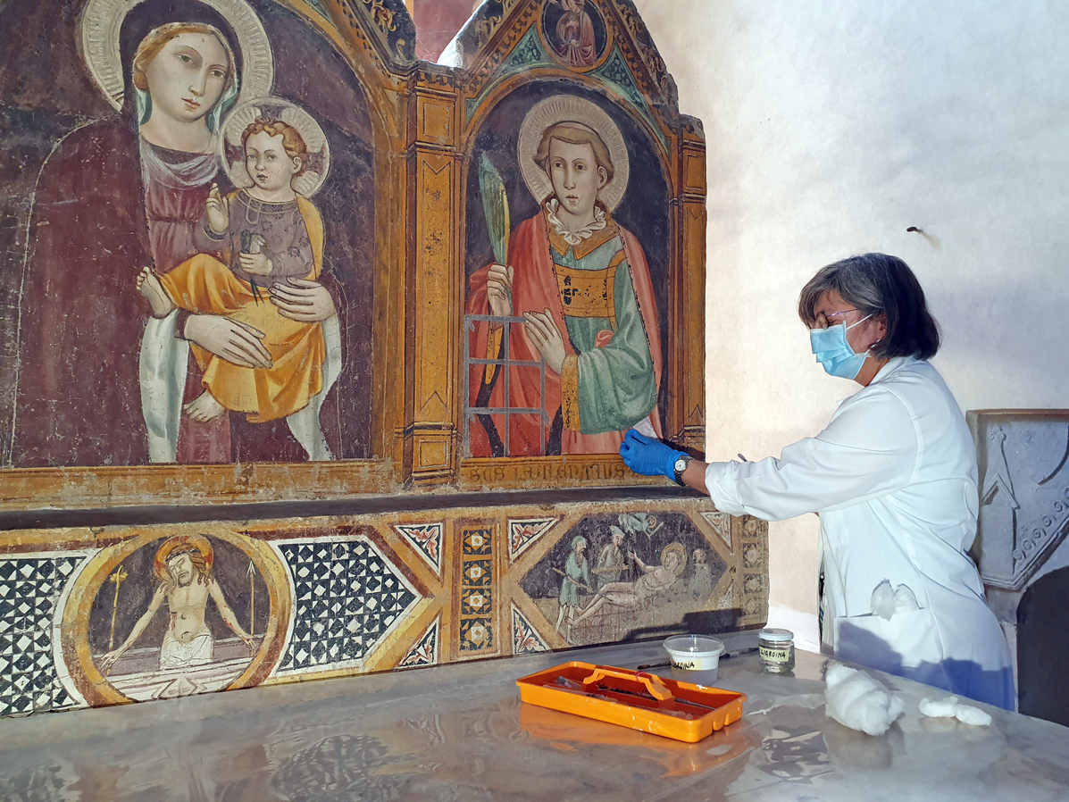 E così dopo i lavori eseguiti lo scorso anno al paramento murario, alla copertura, agli infissi e agli apparati lapidei – realizzati grazie al contributo di Confartigianato – che hanno risolto i rischi di deterioramento dovuti all’umidità di risalita, adesso è il momento dell’attività di consolidamento e conservazione delle pitture murali. L’intervento di restauro riguarda, infatti, la zona absidale, un’area circoscritta degli affreschi in cui risaltano le immagini dell’Annunciazione, di Santa Maria egiziaca e dell’altare dipinto dove, nel paliotto, è perduta parte della pellicola pittorica della raffigurazione con il Cristo in pietà.