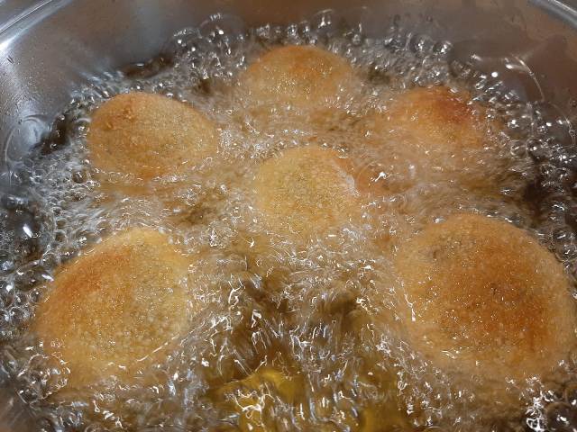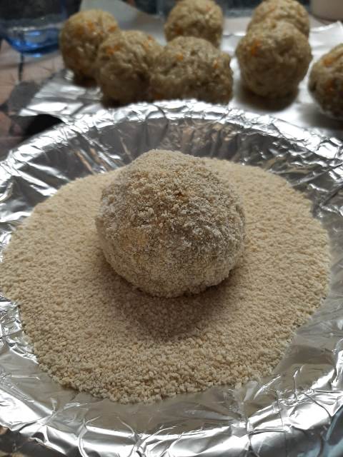 Se volete una impanatura più ricca Laura ha preso due uova ci ha aggiunto un pizzico di sale, pepe, paprica, e li ha sbattuti e poi ha passato le palline nell'uovo, poi nella farina e per ultimo nel pangrattato. Mentre per la cottura del riso l'ha tostato e poi cotto nel brodo vegetale, senza utilizzare lo zafferano e il formaggio.