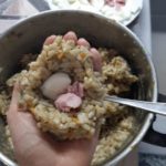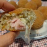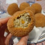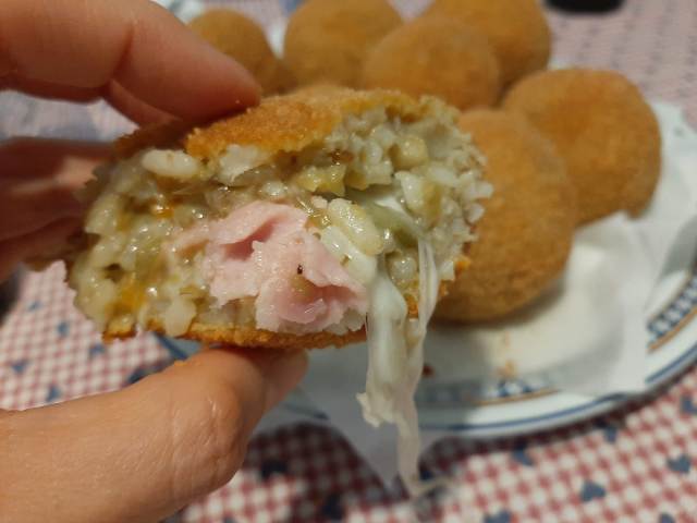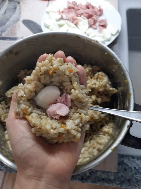 Il giorno dopo, il riso sarà pronto per preparare gli arancini. Scolate per mezz’oretta la mozzarella, lasciandola all’interno di uno scolapasta. In seguito tagliate il prosciutto e la mozzarella a dadini. Bagnatevi le mani e ravvivate il riso, muovendolo un pochino. Sempre con le mani bagnate, prelevate un pugno di riso e dategli una forma tondeggiante. Create una cavità al centro e inserite un po’ di prosciutto e 2-3 dadini di mozzarella. Prelevate una piccola quantità ancora di riso e ponetela sopra alla cavità e formate la palla, che deve essere piuttosto liscia e compatta.