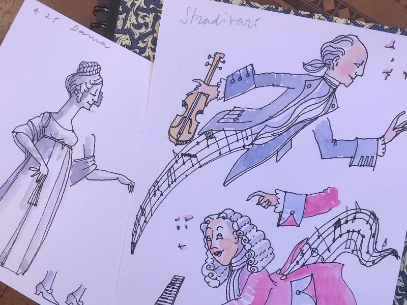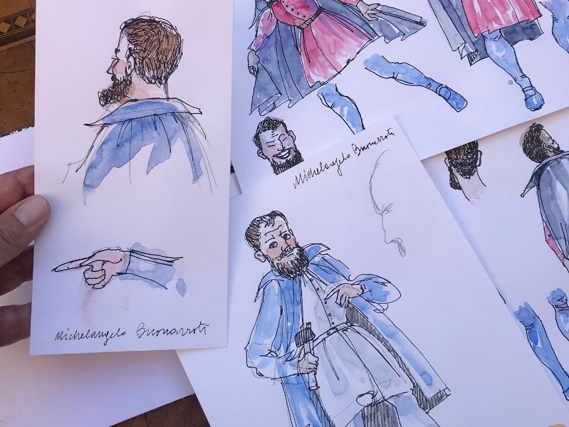 Dall’imponente statua del David che domina la Tribuna - Sì, pare che vengano da tutto il globo terracqueo solo per lui … si lamenta Taddeo Gaddi – si passa ai trittici e le pale d’altare, quei fondi oro che hanno fatto brillare la fantasia di Michelangelo e di cui la Galleria dell’Accademia conserva la collezione più importante al mondo. Segue una carrellata sulle opere, tra gli altri, di Sandro Botticelli con il suo maestro Domenico Ghirlandaio, e del Pontormo. Per l’organizzazione della festa di San Luca sono chiamati a far musica Antonio Stradivari e Bartolomeo Cristofori, due azzimati signori in redingote, che appaiono dagli strumenti musicali antichi che gli appartenevano, rispettivamente la famosa ‘viola’ e il ‘clavicembalo’ della Collezione del Conservatorio Luigi Cherubini, conservati nel Dipartimento degli strumenti musicali. E Bartolomeo Cristofori ha il privilegio “…di aver inventato la più rivoluzionaria macchina sonora che con dei martelli che percuotano le corde…, cioè l’arpicimbalo che poi sarebbe diventato il famoso pianoforte…”