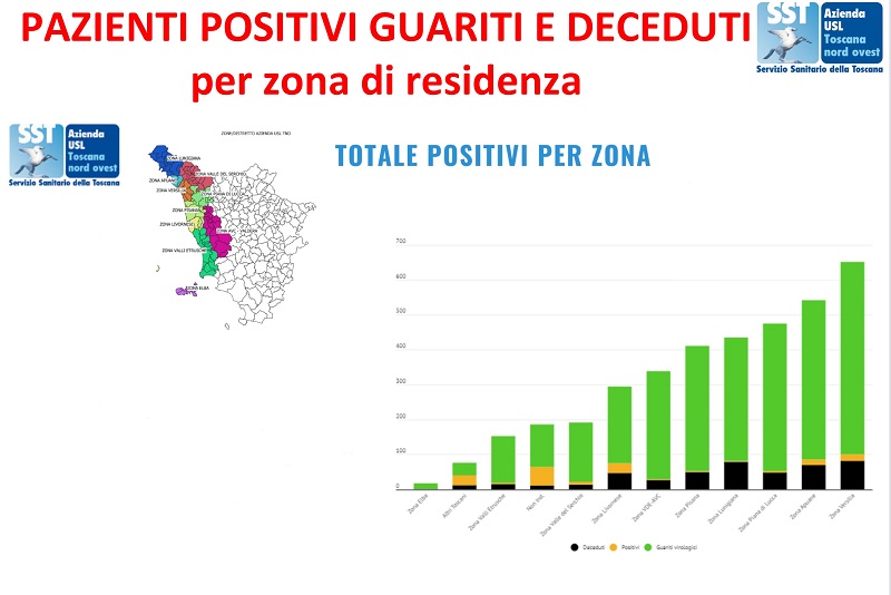 Si ricorda anche che l’Asl Toscana nord ovest, con la sua statistica, incrocia vari dati legati ai pazienti e lavora sulla residenza, e non sul domicilio, delle persone. Per questo ci possono essere delle piccole discrepanze rispetto ai dati per domicilio ed a quelli legati alla provincia di richiesta dei tamponi (quest’ultimo criterio è quello utilizzato dalla Regione Toscana nei suoi bollettini quotidiani).