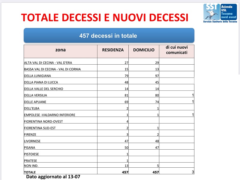 A ieri (12 luglio 2020) i decessi sul territorio dell’Asl Toscana nord ovest erano 457.
