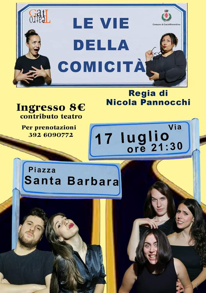 Cosa pensano un uomo e una donna al primo appuntamento? Quale è la distanza che separa il loro pensiero reale da quello che si dicono, per apparire più belli e affascinanti? Se volete scoprirlo in modo divertente ripensando magari a qualche episodio che vi è accaduto in passato non vi resta che venire a “Le Vie della Comicità”, spettacolo che l’associazione teatrale culturale Gat (regia di Nicola Pannocchi) presenta nella suggestiva cornice di Piazza Santa Barbara, nel centro storico di Castelnuovo d’Elsa, venerdì 17 luglio (ore 21.30).