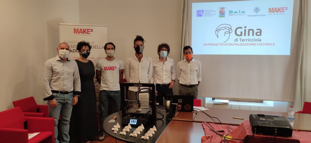 Il progetto nato dalla collaborazione tra Comune di Terricciola (Pi), Polo Tecnologico di Navacchio (Pi) con MakeX, la Rete Toscana della Manifattura Digitale, il Dipartimento di Ingegneria Civile e Industriale Università di Pisa, la Soprintendenza Archeologia Belle Arti e Paesaggio per le province di Pisa e Livorno ha permesso di legare a doppio filo tradizione e innovazione, attraverso la contaminazione incrociata tra tecnologia e storia grazie alla scannerizzazione 3D del reperto. Il lavoro svolto su Gina, manufatto, datato al secondo quarto del II secolo a.C. , è stato un momento di crescita e di scambio reciproco di know-how per tutti i soggetti coinvolti. I files ottenuti attraverso la digitalizzazione potranno essere usati per mappare lo stato di conservazione del reperto, costituire memoria storica andando ad arricchire un catalogo multimediale o un museo digitale, riprodurre delle copie perfette grazie all’utilizzo della stampa 3D, coinvolgere gli utenti in esperienze interattive sia ai fini didattici che turistici.