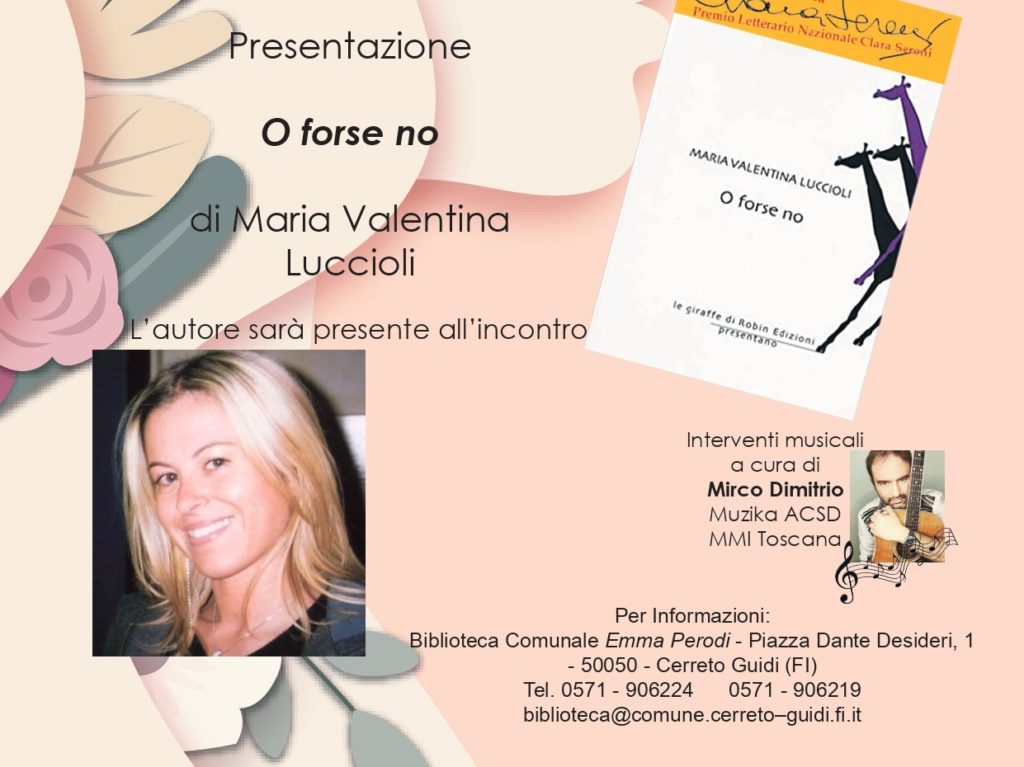 Incluso nel nutrito programma di “Cerreto di Sera”, il contenitore di eventi in programma fra luglio ed agosto, si terrà Venerdì 17 luglio alle ore 21,15 in Piazza Dante Desideri, la presentazione del libro “ O forse no” di Maria Valentina Luccioli. La serata che fa parte del ciclo “Leggere Fuori”, sarà introdotta dal Sindaco di Cerreto Guidi Simona Rossetti e coordinata dal giornalista Massimo Mancini.