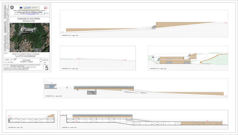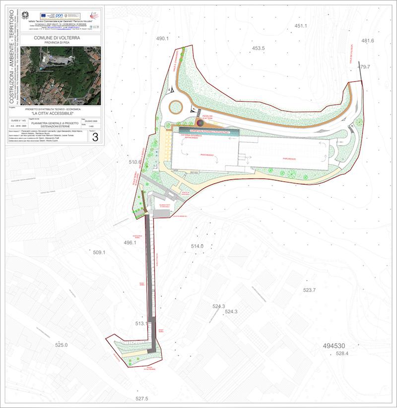 L’Amministrazione Comunale e l’IT.C.G. “F. NICCOLINI” di Volterra hanno inteso collaborare su uno dei temi centrali nello sviluppo del livello di accessibilità al centro storico della Città: la realizzazione di uno smart-parking con la dotazione di servizi di prima accoglienza. Il progetto, a cui è stato assegnato il titolo “La Città Accessibile”, rientra nell’ambito delle attività formative di alternanza Scuola – lavoro che hanno preso avvio e si sono strutturate con non poche difficoltà per l’intervenuta emergenza Covid nell’anno scolastico 2019/2020 da poco concluso. Alle complesse attività di carattere multidisciplinare (Costruzione, Progettazione, Topografia, Estimo) hanno partecipato gli allievi delle classi 3a e 5a sez. A del Corso C.A.T (Costruzione Ambiente e Territorio ex Corso Geometri) coordinati dai docenti interni nelle persone dei proff. Stefano Pasqualetti, Fernando De Pascalis, Lorenzo Faraoni e Chiara Pasqualetti con la collaborazione dell’I.T.P Francesco Messina e dei geom. Vittorio Cucini per il rilievo topografico e la sua restituzione e del del geom. Alessandro Failli, ex alunno del Niccolini, per la modellazione 3D e comunicazione infografica. Tali attività hanno avuto come obiettivo principale quello di coinvolgere gli studenti in una vera e propria esperienza di lavoro professionale nell’ottica dell’universal design (norme UNI/PdR 24/2016) e condizionata dagli stringenti e generali vincoli normativi urbanistici, tecnico costruttivi, paesaggistici, archeologici e in un quadro di particolare attenzione alle disposizioni in materia di superamento delle barriere architettoniche. Sul fronte dell’accessibilità il progetto si è spinto nella definizione di un collegamento meccanizzato lungo una delle due gradonate che si dipartono dalla Fonte di Docciola, quella della Via della Fonte. Le operazioni di rilievo topografico e architettonico e la coerente fase di restituzione grafica in ambiente CAD si sono concluse nel gennaio 2020. Tale evenienza ha consentito di sviluppare il progetto durante l’emergenza Covid in modalità di didattica a distanza sfruttando le potenzialità di integrazione per parti del software CAD. I requisiti del progetto di uno smart-parking nell’area di Docciola, che occupa una superficie di ca. 8.600 mq, sono stati concordati con l’Ufficio Tecnico del Comune di Volterra e possono essere così sinteticamente distinti: