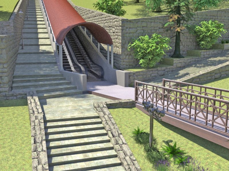 Nella planimetria di progetto con le sistemazioni esterne (TAV. 3) si osserva la modificata viabilità. Lungo il margine più a valle del piazzale è stata prevista una nuova strada a doppio senso di circolazione. Nella parte altimetricamente più bassa della nuova strada si trovano l’ingresso e l’uscita dal nuovo parcheggio. Dalla parte opposta è prevista una rotatoria per il raccordo con la viabilità esistente e per assicurare l’inversione di marcia per i mezzi pubblici. Dalla medesima rotatoria, con accesso controllato, è previsto l’ingresso alla viabilità interna pavimentata in asfalto ecologico a servizio degli stalli riservati alle persone con disabilità, all’infopoint e da qui, pedonalmente, alla porta di Docciola. Nella zona infopoint si attestano le uscite differenziate dallo smart parking. Si tratta di un parcheggio per sole autovetture e moto a due livelli. Il piano terra e quello di copertura sfruttano il naturale dislivello presente nel piazzale di Docciola, creando due aree di sosta delimitate da quinte murarie perimetrali a delimitare gli elementi prefabbricati e modulari in acciaio aventi una maglia di m. 5x5 ed un’altezza di m.2,70. Il livello superiore è previsto ad una quota inferiore della viabilità esistente in modo da ridurne la visibilità dall’esterno. Le parti emergenti dal muro perimetrale come l’altro in cui insistono ingresso e uscita del parcheggio sono pensate rivestite con brise-soleil in legno in modo da mitigarne l’impatto da valle. L’accessibilità al parcheggio è completamente automatizzata. Su parte del livello più in alto del parcheggio sono previsti dei posti auto coperti con una pensilina in pannelli fotovoltaici, in grado di assicurare la produzione dell’energia elettrica necessaria al funzionamento del parcheggio. Sul margine ovest del parcheggio, lungo la viabilità interna a minor pendenza, sono previsti otto posti auto per persone su sedia a rotelle, che rivolgendosi al personale dell’infopoint potranno prenotare un servizio di navetta per il trasporto al centro storico (parcheggio e servizio di trasporto gratuiti). Sfruttando i dislivelli è ipotizzabile anche la realizzazione di una cisterna antincendio. La capacità massima del parcheggio prevede 334 posti auto e 34 stalli per motocicli. Considerato come un servizio essenziale l’infopoint è stato progettato secondo una tipologia ipogea, con un solo fronte visibile dall’esterno, così da ridurne l’impatto nel contesto complessivo. Il locale destinato a punto di accoglienza risulta quindi incassato nella scarpata sul lato ovest della viabilità di progetto, nelle immediate vicinanze delle uscite pedonali del parcheggio. Dall’infopoint è previsto l’accesso diretto all’impianti meccanizzato di risalita per accedere al centro storico della Città. In adiacenza del punto di accoglienza sono stati previsti i servizi igienici ed un locale tecnico per gli impianti tecnologici (inverter, serbatoi idrici e pompe). L’illuminazione naturale dell’infopoint e dei servizi igienici può limitarsi a quella diffusa da lucernari posti in copertura. Come detto all’impianto di risalita meccanizzata si accede direttamente dall’infopoint, mediante una galleria al di sotto delle mura medioevali. Mediante due scale mobili con pendenze contrapposte si giunge all’interno delle mura ad un livello superiore rispetto al ripiano da cui si dipartono le due rampe di gradonate e da cui ha origine il vero e proprio collegamento verticale meccanizzato che occupa parte del lato destro della gradonata per chi sale. A copertura del collegamento è prevista una struttura a volta metallica con manto in lamiera di rame.