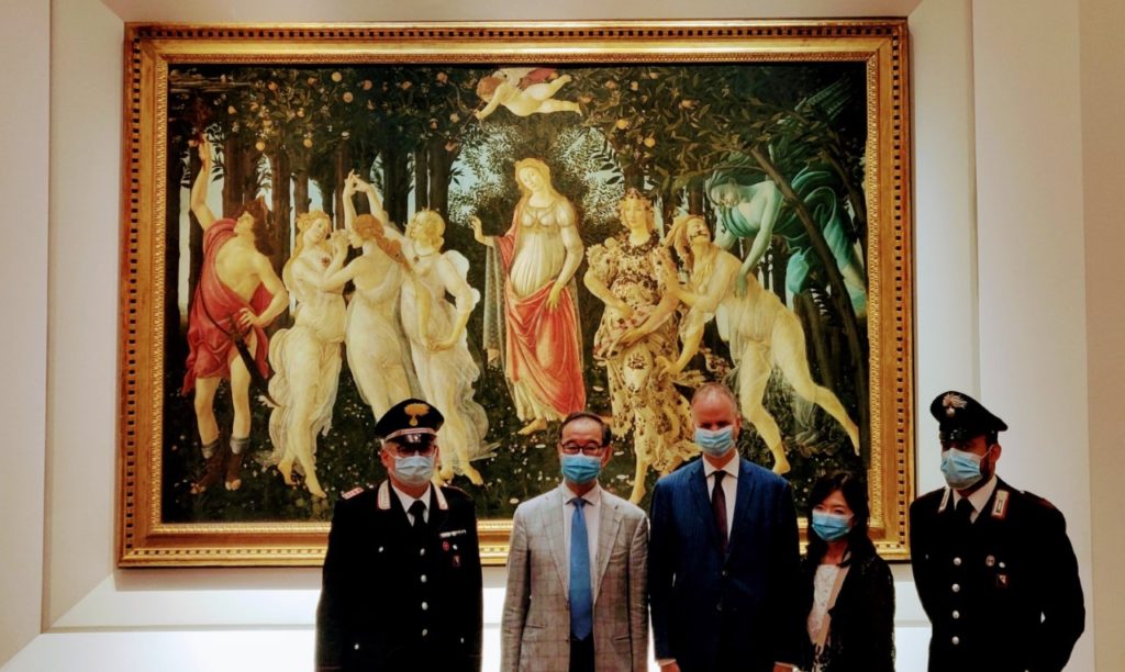 L'ambasciatore del Giappone in Italia Hiroshi Oe in visita ufficiale alla Galleria degli Uffizi di Firenze. Oe era già stato nel celebre museo 40 anni fa: oggi, a Firenze per partecipare ad un evento internazionale, non ha voluto perdere l'occasione di tornare ad ammirarne i tanti capolavori una seconda volta. Accolto in galleria dal direttore Eike Schmidt, l'ambasciatore si è soffermato in particolare nelle sale di Botticelli, concedendosi qualche scatto davanti alla Primavera.