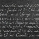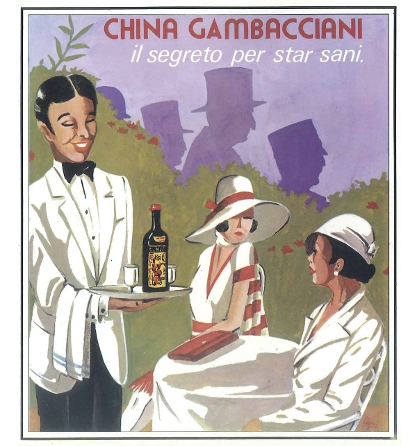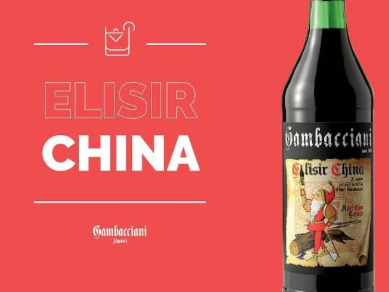 La China Gambacciani è ricordata per un felice slogan da sempre presente sull'etichetta, con l'elfo che pronuncia queste parole: "Il segreto per star sani è la China Gambacciani". Accompagnavano lo slogan, soprattutto nella fortunata pubblicità degli anni '60, in manifesti e locandine, questi rapidi versi "Per gli sciocchi non c'è medicina/ e per i furbi c'è la china./Ma non basta una china qualunque/che trovar si può dovunque./Se volete un liquore squisito/che vi stuzzichi l'appetito/ve lo insegna il re dei nani/è la China Gambacciani". Lo slogan porta con sé l'origine di questo elisir classico, che diventa tale solo a metà Ottocento, affiancandosi all'uso farmaceutico.