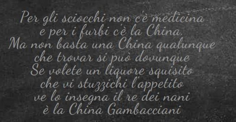 La China Gambacciani è ricordata per un felice slogan da sempre presente sull'etichetta, con l'elfo che pronuncia queste parole: "Il segreto per star sani è la China Gambacciani". Accompagnavano lo slogan, soprattutto nella fortunata pubblicità degli anni '60, in manifesti e locandine, questi rapidi versi "Per gli sciocchi non c'è medicina/ e per i furbi c'è la china./Ma non basta una china qualunque/che trovar si può dovunque./Se volete un liquore squisito/che vi stuzzichi l'appetito/ve lo insegna il re dei nani/è la China Gambacciani". Lo slogan porta con sé l'origine di questo elisir classico, che diventa tale solo a metà Ottocento, affiancandosi all'uso farmaceutico.