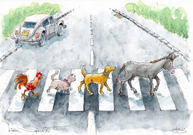 Così l'italiano Guazzone si è guadagnato il bugiardino d'oro disegnando Pollicino che ritrova la strada di casa seguendo non i sassolini ma i segnaposizione di Google. Il suo collega rumeno ha primeggiato disegnando una particolare versione della famosa foto dei Beatles sulle strisce pedonali con gli animali musicanti di Brema, un asinello un cane, un gatto e un gallo ad attraversare la strada.