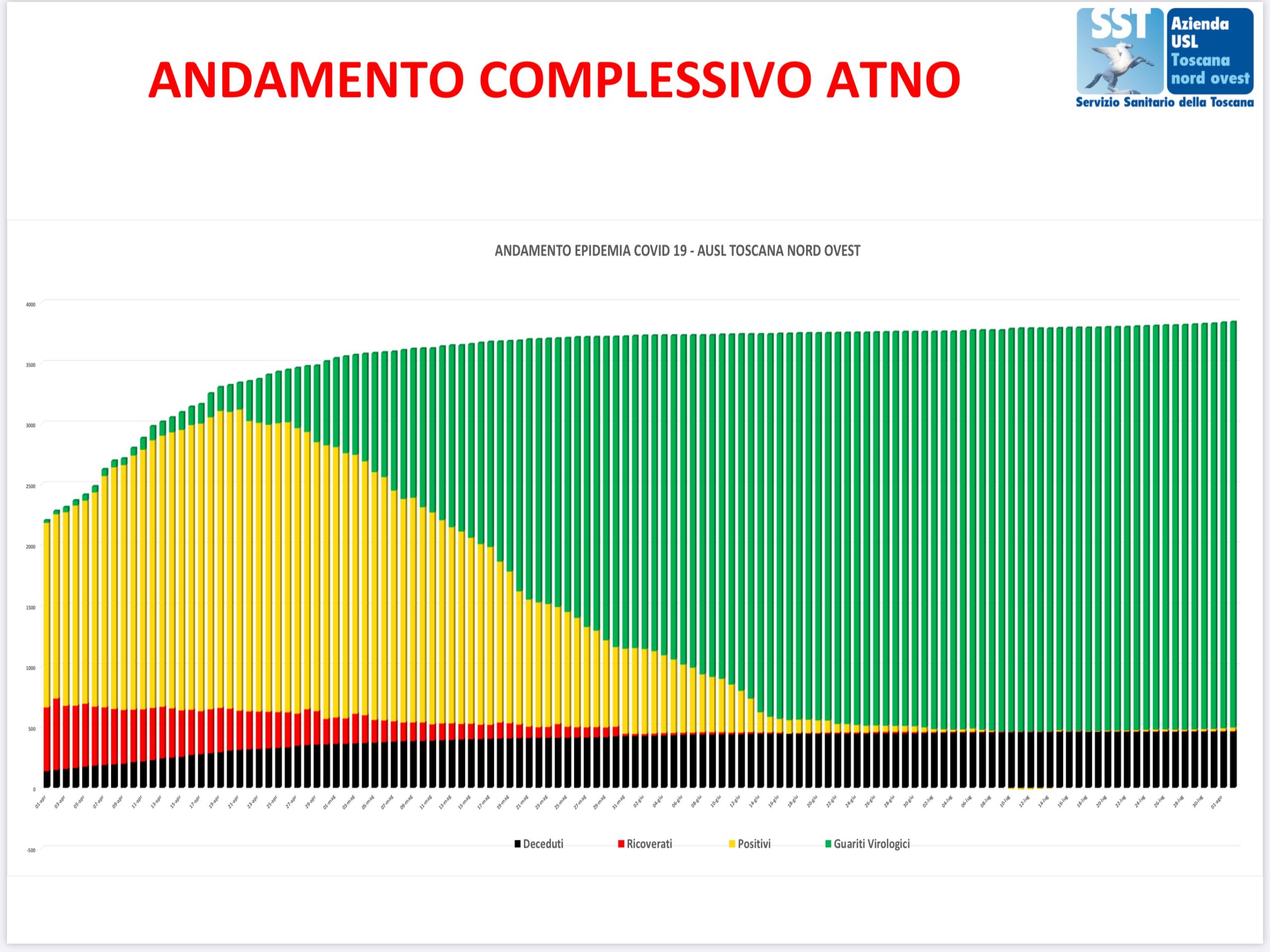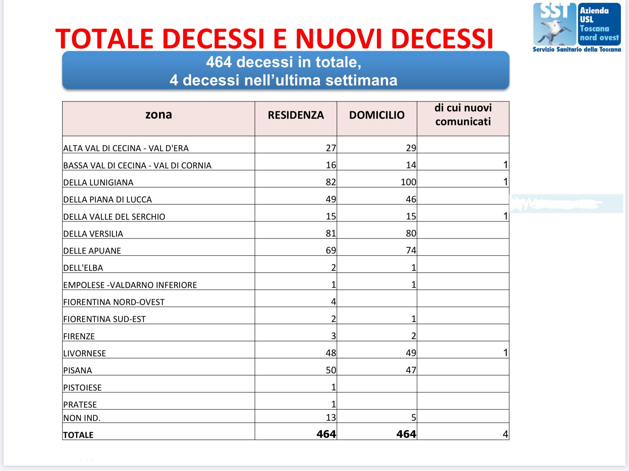 Ad oggi (4 agosto) i decessi sul territorio dell’Asl Toscana nord ovest sono 464 (nell’ultima settimana ce se sono stati 4, nessuno in data odierna).