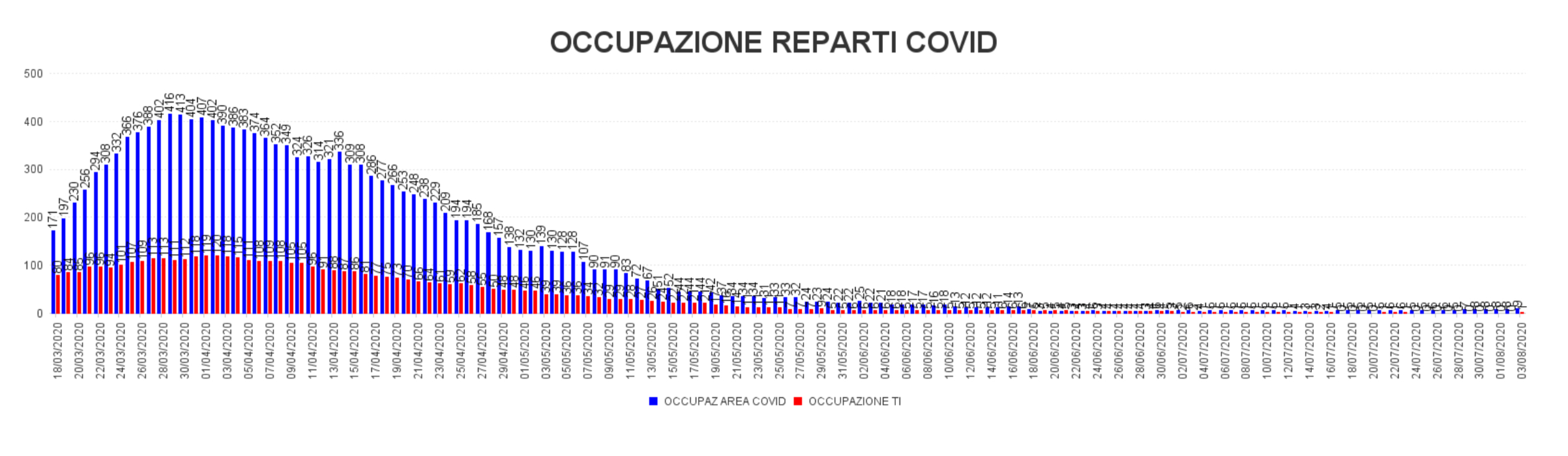 In allegato (immagine 4) viene visualizzata anche graficamente l’occupazione dei posti letto da parte di pazienti Covid negli ospedali dell’area Toscana nord ovest, con una costante riduzione dei ricoveri, dopo il “picco” che si era registrato nei reparti di Terapia intensiva e nelle aree Covid nel periodo dal 28 marzo al 3 aprile 2020.