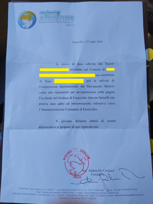 Un giovane cittadino di Fucecchio ha fatto visita questa mattina al sindaco Alessio Spinelli per informarlo della sua donazione in favore del Movimento Shalom come "scusa" per un proprio gesto non certamente lodevole.
