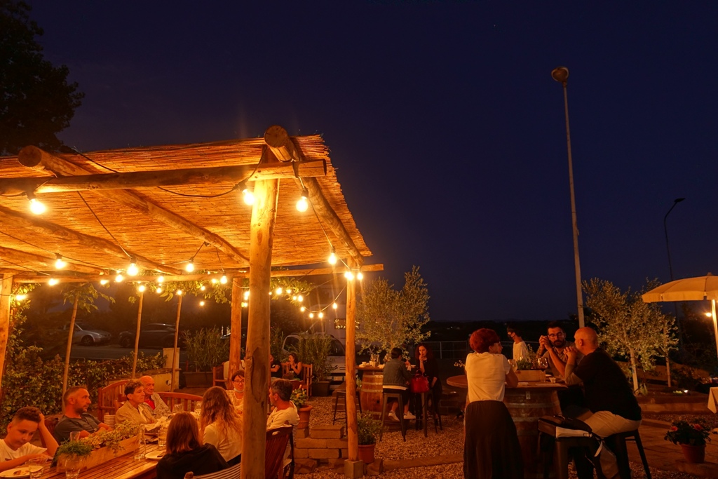 Per la stagione estiva Degusta offre oltre agli ampi spazi interni anche il cortile esterno con tavolini, divanetti, botti e sgabelli in una cornice in pieno stile toscano, che si integra perfettamente con le campagne di Montespertoli. L'ambiente è curato e piacevole da vivere, specialmente al tramonto all'esterno durante l'estate.