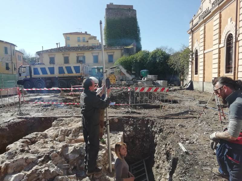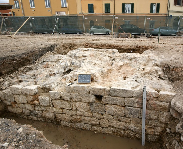 L’inaspettata scoperta è avvenuta in occasione dei lavori di riqualificazione della piazza d’ingresso ai Vecchi Macelli. In largo Spadoni è tornato alla luce un tratto delle mura Repubblicane abbattuto agli inizi del ‘900 per aprire un varco ai Macelli Pubblici, costruiti nell’immediata periferia della città per motivi di igiene e decoro pubblico. Lo scavo, finalizzato al posizionamento di alberature e di una serie di cavidotti elettrici per la nuova illuminazione, è stato quindi necessariamente affiancato dall’assistenza archeologica, curata dalle archeologhe Elisabetta Abela, Chiara Condoluci e Maila Franceschini con la direzione scientifica della dottoressa Claudia Rizzitelli della Soprintendenza Archeologia Bella Arti e Paesaggio di Pisa e Livorno.