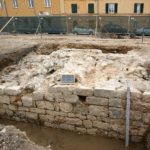 Poco distante è stata anche rinvenuta una porzione del muro semicircolare intonacato che delimitava l’ingresso ai Macelli e chiudeva lo slargo, appoggiandosi al tratto superstite delle mura repubblicane quando ancora non esisteva la via Rustichello di Pisa.