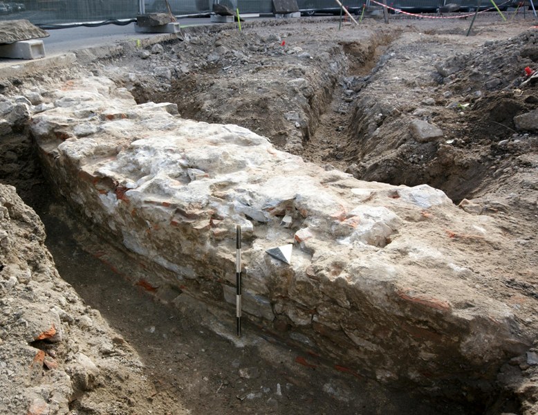 L’affioramento della struttura muraria sull’allineamento delle fortificazioni ancora esistenti, a poche decine di centimetri dal piano stradale attuale, ha indotto la direzione dei lavori, in accordo con la Soprintendenza competente, ad ampliare le indagini con l’apertura di un saggio di quattro metri per tre, scavato fino alla profondità di un metro e mezzo. Le mura portate alla luce, spesse circa due metri e mezzo, furono costruite con la tecnica a sacco e conservano ancora entrambe le cortine in blocchi squadrati in calcare di San Giuliano, divise da un’intercapedine riempita con materiale frammentario legato con malta tenace. Sono inoltre ben visibili, su entrambi i lati, due buche pontaie, cioè le tracce delle impalcature lignee a sostegno dei ponteggi. Questo tratto delle mura urbane fu costruito tra il 1160 e il 1161 e con esso si completò il perimetro murario che chiudeva la città sul lato destro dell’Arno.