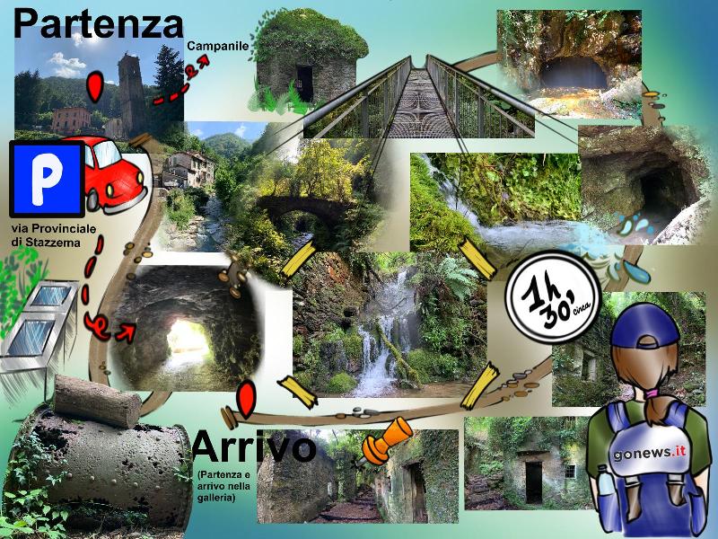 Proprio da quella che era la chiesa di Don Fiore parte il quinto percorso di Passi da Principiante. La macchina, arrivati a Mulina, può essere parcheggiata nei pressi di via Provinciale di Stazzema. Dovrete comunque prendere come riferimento il campanile della chiesa, che si innalza accompagnato dai tronchi degli alberi. Una volta individuato il gioco è fatto... più o meno. Proseguite per la strada asfaltata in salita alla sinistra del campanile, superando le vasche in pietra fino ad un tunnel scavato nelle rocce naturali. (Consulta la mappa)