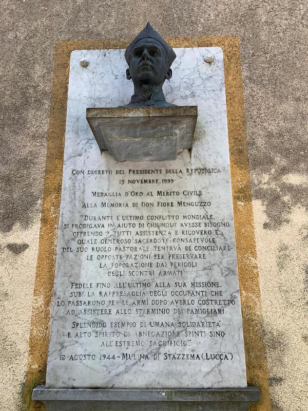 Nella notte tra l’11 e il 12 agosto 1944 le SS arrivarono in paese, in compagnia dei fascisti versiliesi, mentre stavano andando a Sant’Anna. Le zone ricevettero quella estate un ordine di sfollamento che, per svariati motivi, venne disatteso dalle famiglie. Anche Mulina dunque non fu abbandonata dai propri abitanti che però iniziarono a nascondersi nei boschi circostanti. La famiglia del parroco di Mulina, Don Fiore Menguzzo, rimase a vivere nella canonica della chiesa. Don Fiore, nato a Cascina diventò parroco della chiesa di San Rocco di Mulina nel 1941. Una storia incredibile la sua poiché, dopo essere chiamato al servizio militare e inviato come cappellano in Grecia e Albania, fu catturato dai tedeschi e deportato in Germania dopo l’armistizio dell’8 settembre. Il parroco riuscì a fuggire e rientrò subito in Versilia. I primi giorni dell’agosto 1944 ci furono degli scontri tra partigiani e tedeschi da Mulina a Farnocchia e Don Fiore, che al posto del fucile era armato di grande carità, prestò le cure ai feriti. Per questo suo gesto fu proprio un tedesco ad attaccare un biglietto sulla porta della sua canonica chiedendo rispetto per il sacerdote e per il suo impegno. Ben presto però i nazisti classificarono l’attivismo di Don Fiore come vicino ai partigiani. Per questo quella notte, rimasta nella storia e viva ancora oggi anche negli occhi di chi non l’ha vissuta, le SS passando da Mulina di Stazzema andarono verso la canonica per uccidere Don Fiore. Probabilmente fu costretto ad assistere alla morte della propria famiglia, mentre la madre e un fratello si salvarono poiché non si trovavano a Mulina. I nazisti volevano da lui informazioni sui rifugi dei partigiani rimasti in zona. Così il sacerdote quella notte venne interrogato, picchiato e infine ucciso lungo la mulattiera che porta da Mulina a Farnocchia. Il suo corpo fu lasciato lì fino al permesso dei parrocchiani, rilasciato dai tedeschi, per la sepoltura.