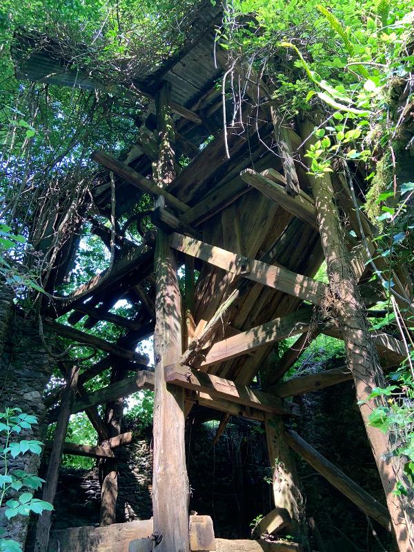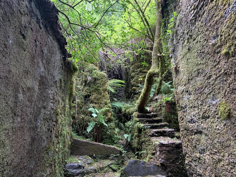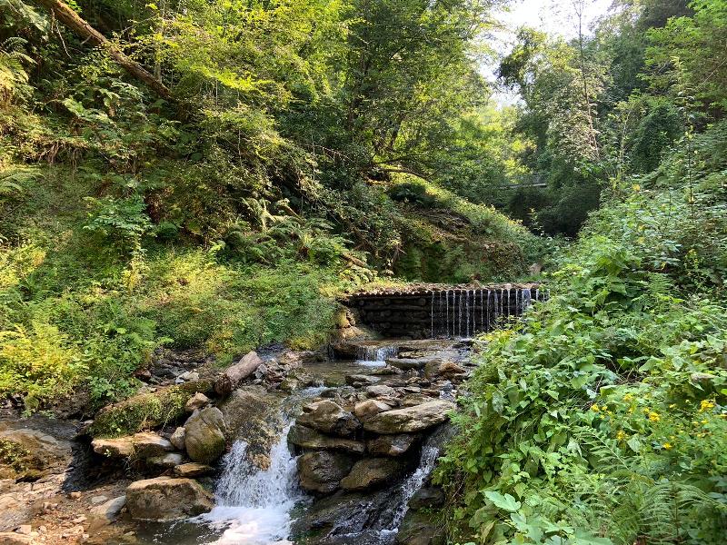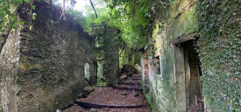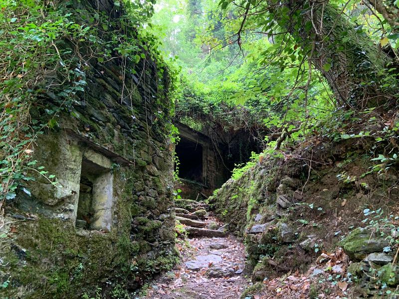 Oltrepassate le grotte, cascate e fonti d’acqua si faranno sempre più presenti fino all’arrivo nella zona popolata dalle strutture, dove venivano prodotti micce e polvere da sparo. Oggi, nel silenzio più totale del luogo dove l’unico rumore che si può sentire è quello delle cicale alternato allo scorrere dell’acqua, lo scenario che si presenta davanti al visitatore è davvero coinvolgente. Sembra un villaggio popolato da creature fantastiche: scalini che scendono e salgono in mezzo alle felci, finestre e porte che ospitano spesso ancora oggi gli strumenti di lavorazione. Tra le strutture, tutte da esplorare senza entrarvi per ragioni di sicurezza, si trova una incredibile cascata. Da qui sembra piovere fortissimo, grosse gocce d’acqua ghiaccia cadono sulle spalle e sulla testa (se vorrete entrarci) facendo sicuramente dimenticare la quantità di gradi presente in estate.