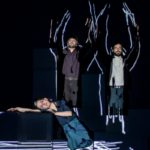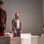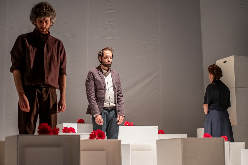 La scenografia interamente bianca, minimalista, con monoliti a forma cubica e con gli interventi visivi, astrae la strage dal contesto per evidenziare la sua universalità: un’umanità crudele che cannibalizza se stessa. Allo stesso tempo i suggestivi interventi visivi di Alessio Trillini danno corpo e creano l’immaginario della storia.