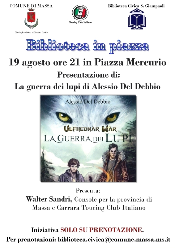 Sarà una serata all’insegna del fantastico e delle creature che popolano le Alpi Apuane e la Toscana, quella che si terrà in Piazza Mercurio a Massa mercoledì 19 agosto. Durante l’incontro della rassegna “Biblioteca in Piazza”, promossa dalla Biblioteca civica S. Giampaoli, dal comune di Massa e dal Touring Club Italia, lo scrittore viareggino Alessio Del Debbio presenterà il suo romanzo “La guerra dei lupi”, primo capitolo della trilogia fantastica “Ulfhednar War” (Edizioni Il Ciliegio).