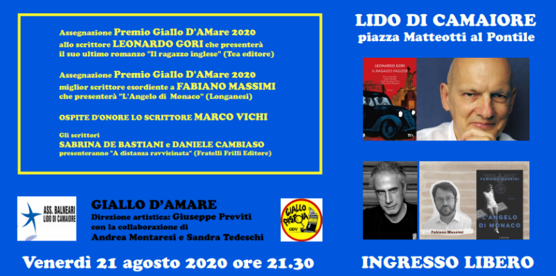 Il premio Giallo d'Amare 2020 sarà quindi assegnato a Leonardo Gori, non solo per il suo ultimo romanzo (“Il ragazzo inglese” edito da Tea), ma per tutta la sua lunga carriera letteraria costellata di successi. Chi si augura di percorrere una strada simile a quella di Gori è forse Fabiano Massimi che intanto, col suo primo romanzo (“L’angelo di Monaco” pubblicato da Longanesi) si aggiudica il premio Esordiente.