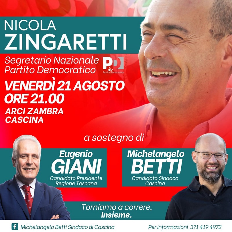 Il segretario nazionale del Partito Democratico Nicola Zingaretti incontrerà, Venerdì 21 agosto alle ore 21 al Circolo Arci Zambra, i cittadini cascinesi nell’ambito delle iniziative della campagna elettorale del centrosinistra. Il segretario Dem sarà presente a Cascina nel giorno della presentazione delle liste per il voto amministrativo del 20 e 21 settembre. Un appuntamento importante, a 30 giorni dalle elezioni, a sostegno della coalizione di centrosinistra in vista degli appuntamenti elettorali per il Comune di Cascina e per la Regione: a fianco di Zingaretti ci sarà Michelangelo Betti, candidato a sindaco del PD, Italia viva, Verdi, Volt, Per Voi e Bene comune. Sarà presente all’iniziativa anche Eugenio Giani candidato Presidente della Regione Toscana.