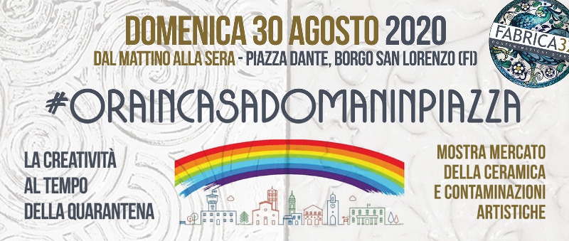 Domenica 30 Agosto, dalla mattina alla sera, nella splendida cornice dei giardini di Piazza Dante a Borgo San Lorenzo prenderà vita “Ora in casa domani in piazza by Fabrica32”, il primo vero evento della ripartenza organizzato dal Comune di Borgo San Lorenzo in sinergia con la Pro Loco di Borgo San Lorenzo, da una idea di Laura Borelli e con la direzione artistica di Serena Pinzani. Una mostra mercato all’interno di un’altra mostra mercato, quella di Fabrica32, il festival della ceramica alla sua terza edizione, che quest’anno si svolgerà in forma ridotta ma con la stessa attenzione alla valorizzazione della nostra arte e del nostro patrimonio artistico.