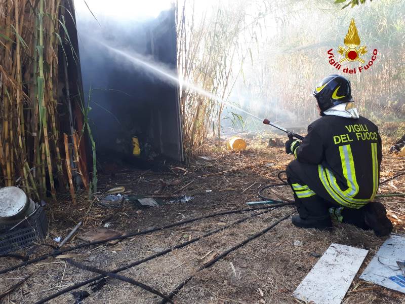 Nell'incendio sono stati coinvolti una roulotte e un container con dentro alcune bombole di gpl, quindi viene usata la massima precauzione.