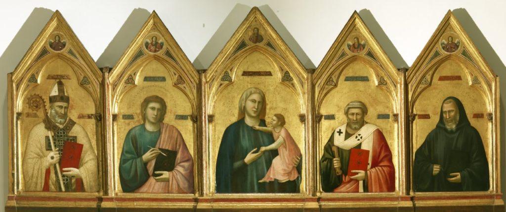 Il Polittico di Badia di Giotto, datato intorno intorno al 1300, è originariamente proveniente dall’altare maggiore della Badia di Firenze, una delle chiese più importanti della città, situata nei pressi dell’abitazione degli Alighieri. Nell’ideale percorso affrontato dalla mostra, l’opera, sicuramente nota a
