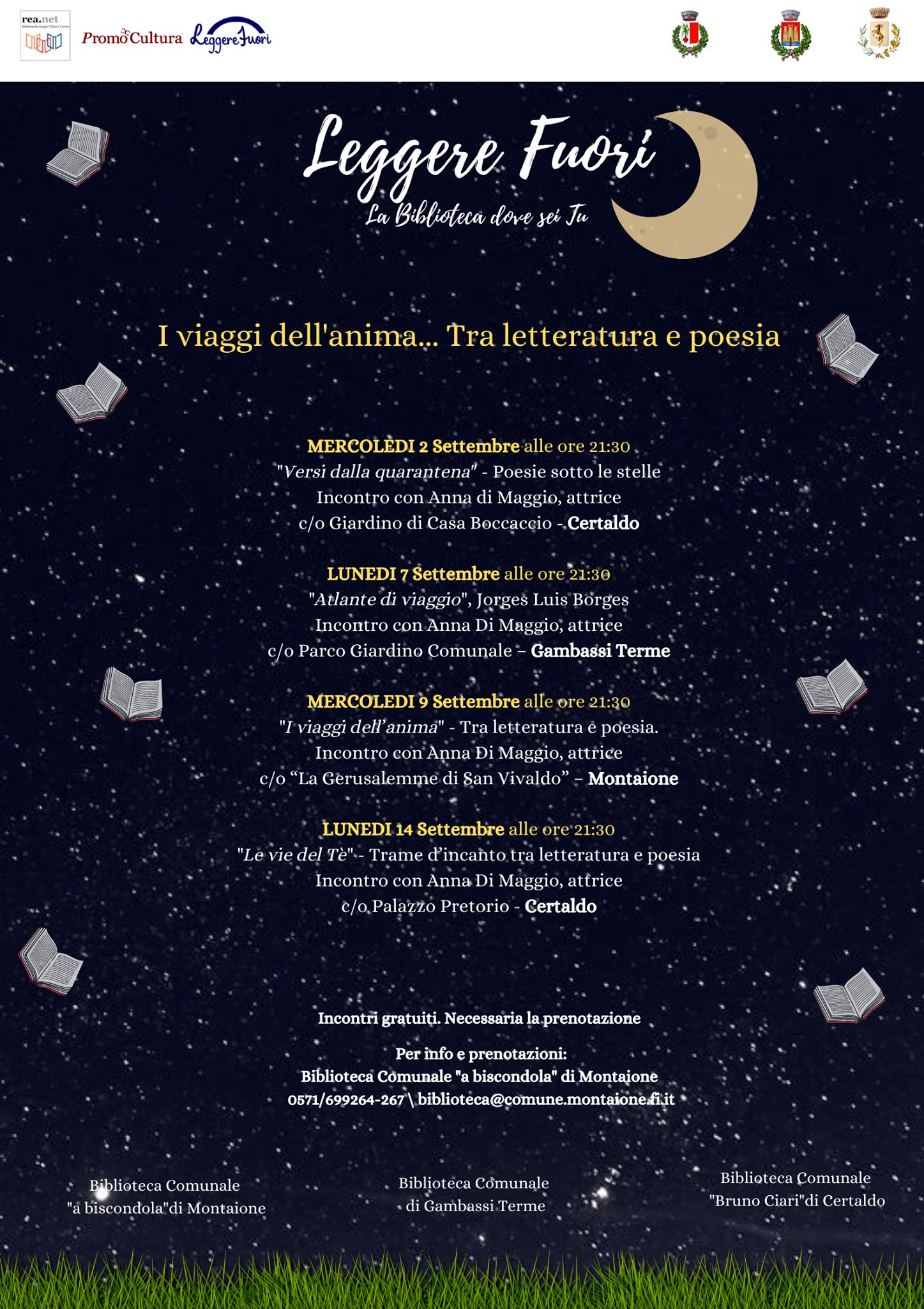 Torna il ciclo di incontri "Leggere fuori" che dopo una serie di eventi per bambini propone adesso quattro incontri con l'attrice Anna Di Maggio pensati per un pubblico più adulto. L'iniziativa dei Comuni di Certaldo, Gambassi Terme e Montaione, nasce grazie alla gestione associata delle rispettive biblioteche, a cura di PromoCultura.
