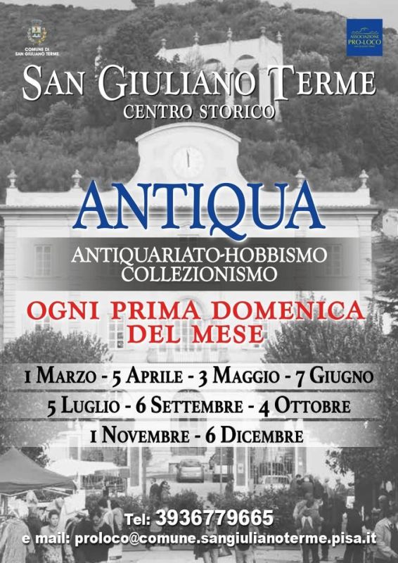 - Domenica 6 settembre appuntamento tutto il giorno con Antiqua, il mercato dell'antiquariato che in occasione del Settembre Sangiulianese si arricchisce con più varietà e più stand in largo Shelley. Antiqua è organizzato dalla proloco di San Giuliano Terme, che per questa edizione del Settembre proporrà al pubblico un numero maggiore di espositori.