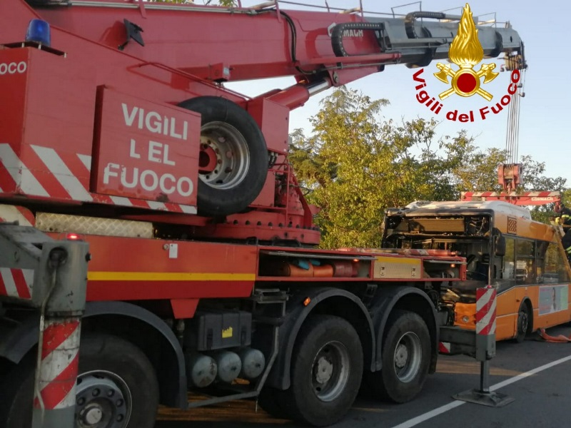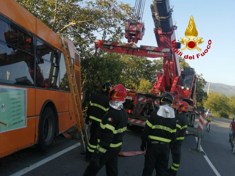 Le squadre, con l'ausilio dell’autogru, hanno sollevato e riportato il bus sulla sede stradale.