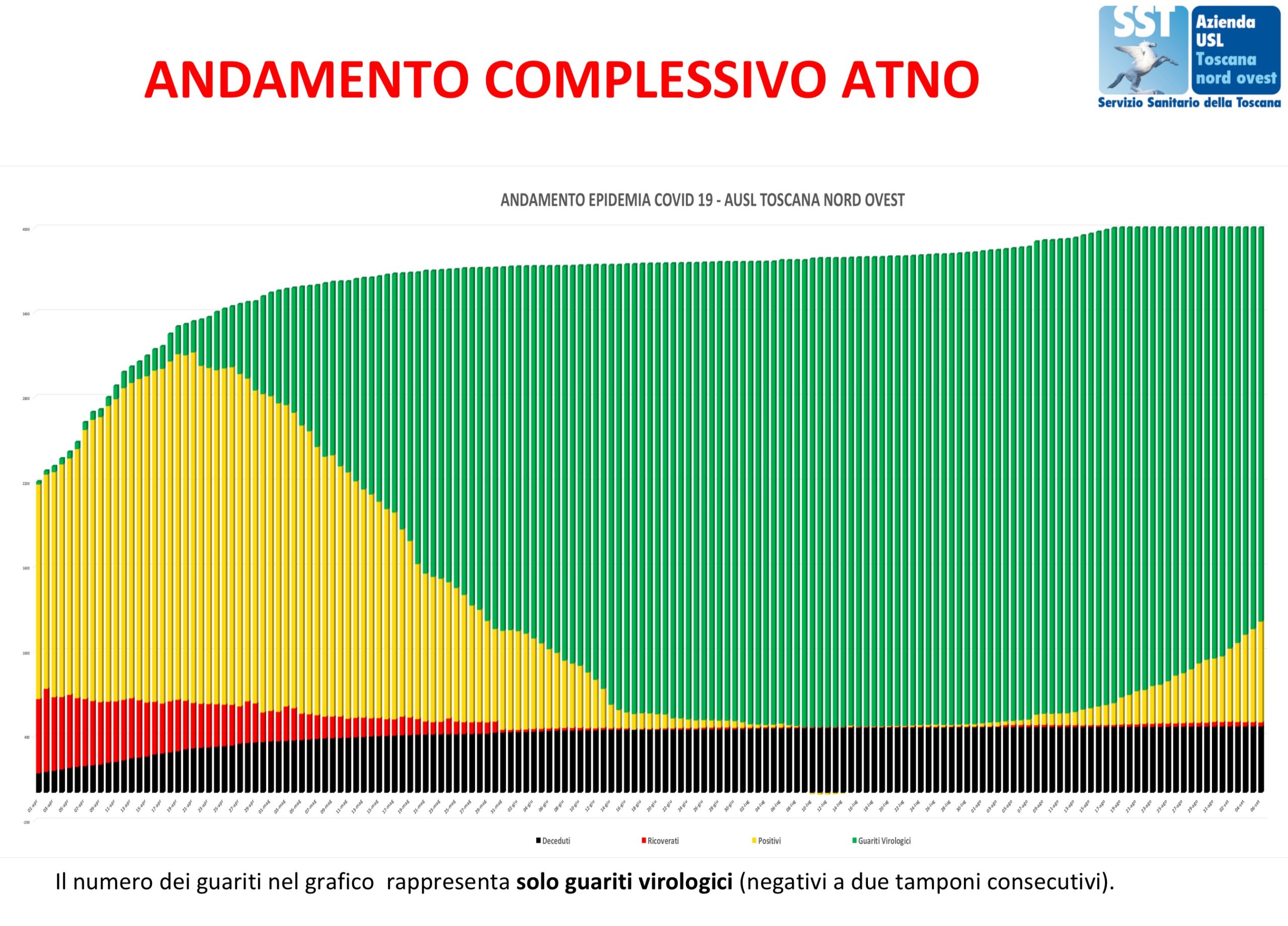 In allegato l’andamento complessivo dell’epidemia Covid-19 sul territorio aziendale con il costante e significativo aumento dei guariti virologici (in verde).
