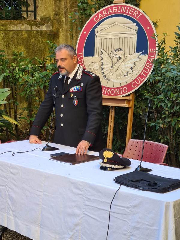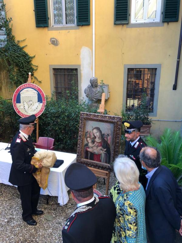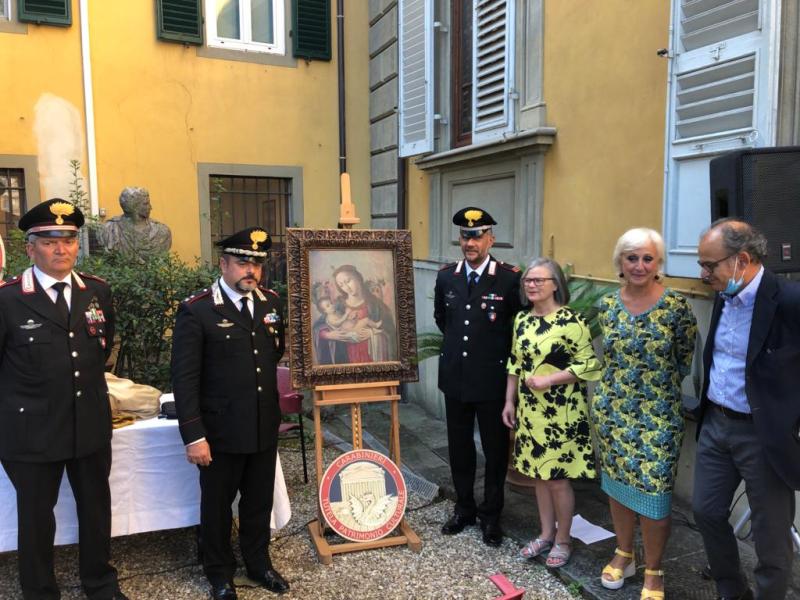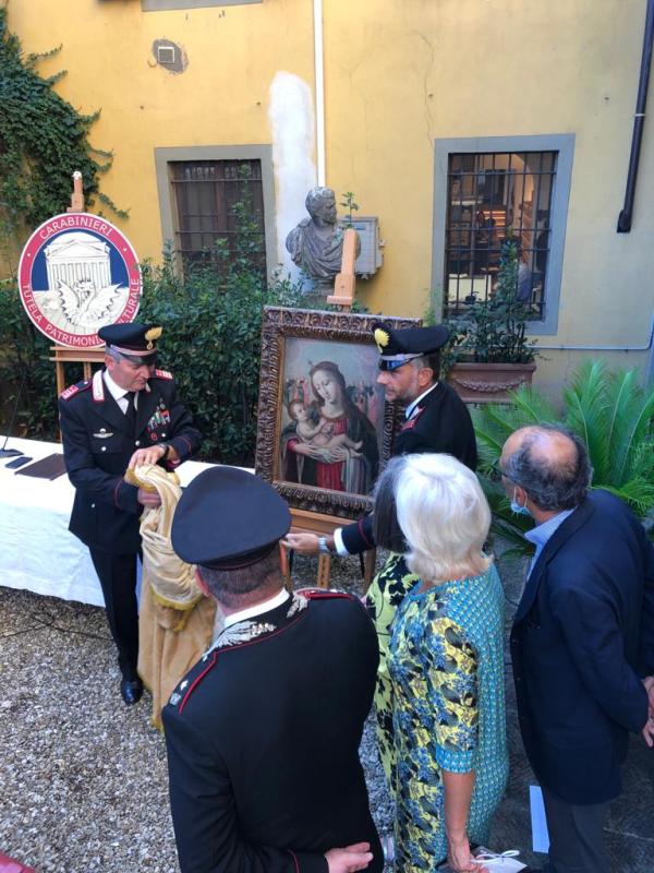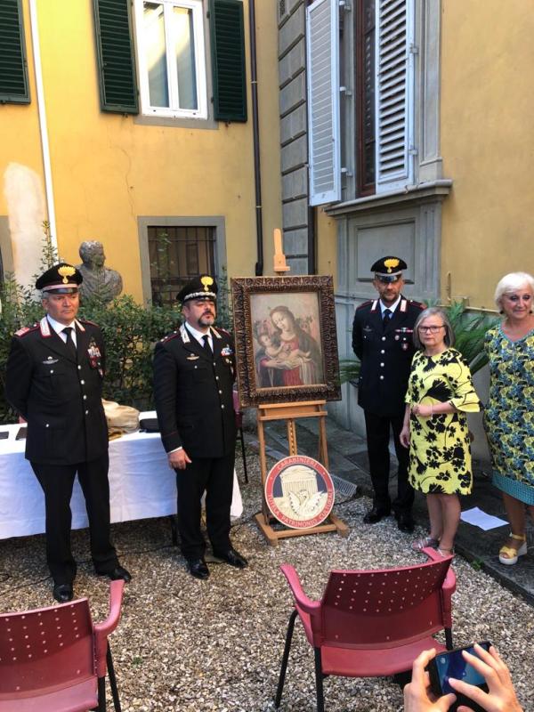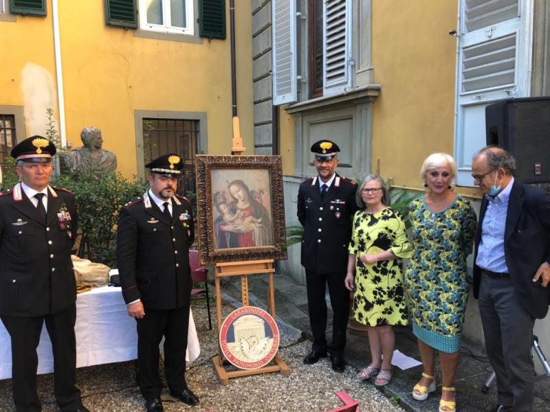 Oggi nel giardino del Museo Casa Siviero a Firenze, il maggiore Lanfranco Disibio, Comandante del Nucleo Carabinieri Tutela Patrimonio Culturale di Firenze, alla presenza di Alessandro Compagnino, dirigente del settore Cultura della Regione Toscana, ha restituito al Museo Casa Siviero, un dipinto, olio su tavola, in cornice coeva, cm. 67 x 51.5, raffigurante “Madonna col Bambino e Santi” del XVI secolo, rubato negli anni ’90 dal citato museo.